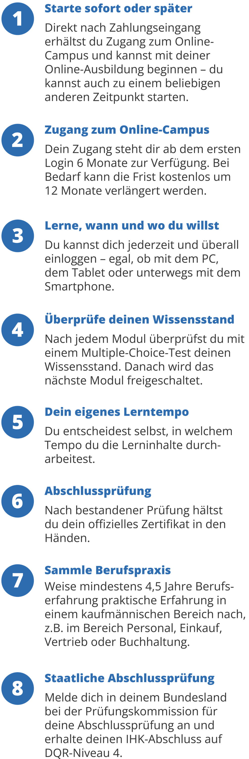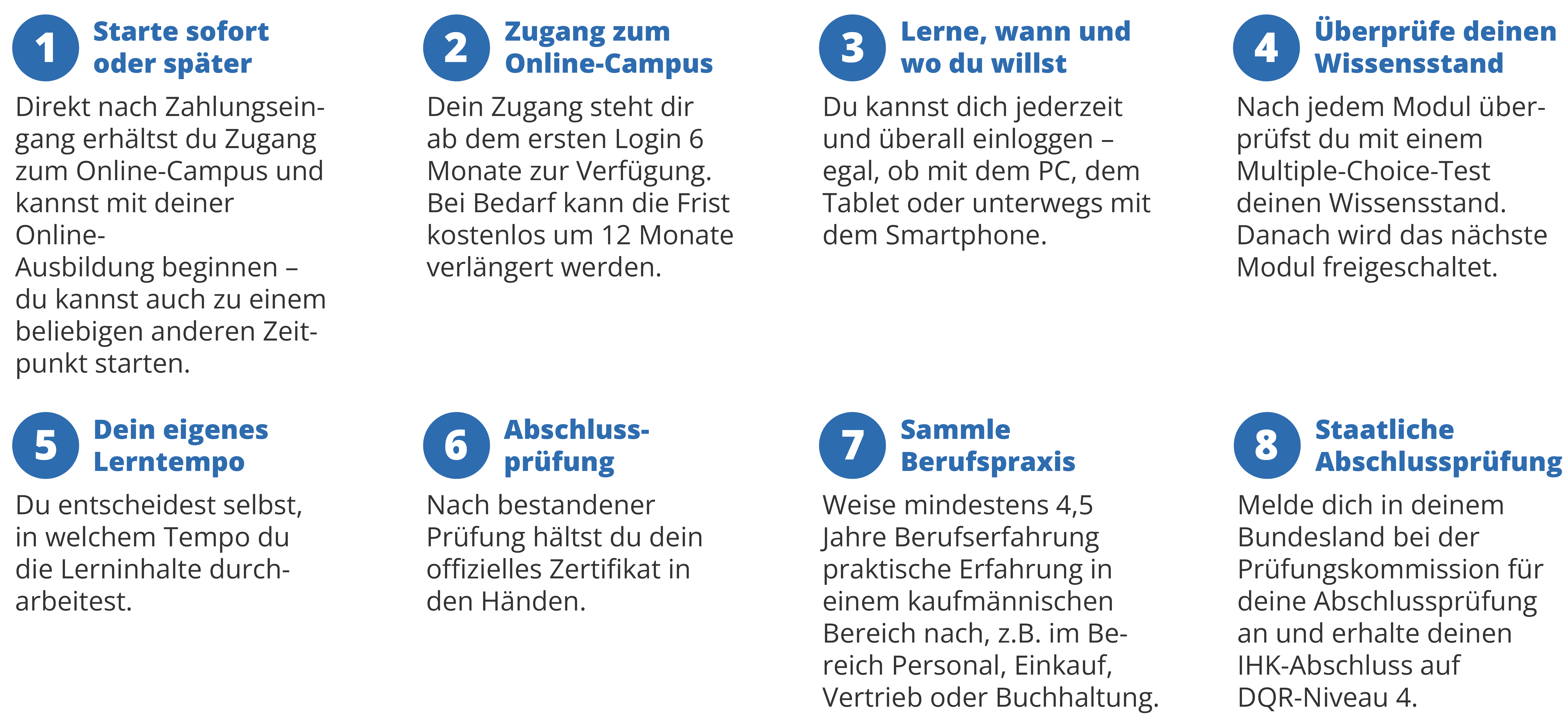 Voraussetzung dafür ist, dass du mindestens 4,5 Jahre Berufspraxis in einem kaufmännischen Bereich nachweist.